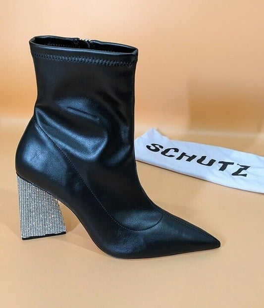 Schutz Cyrus Women's Black Leather Heels Booties Point Toe Size 10 (MSRP $218)