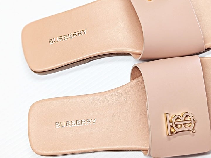 Burberry "Sloane" sandals crafted from smooth calf leather 0.17 in / 5 mm flat heel Square toe Single band with gold-tone metal TB monogram Slip-on style