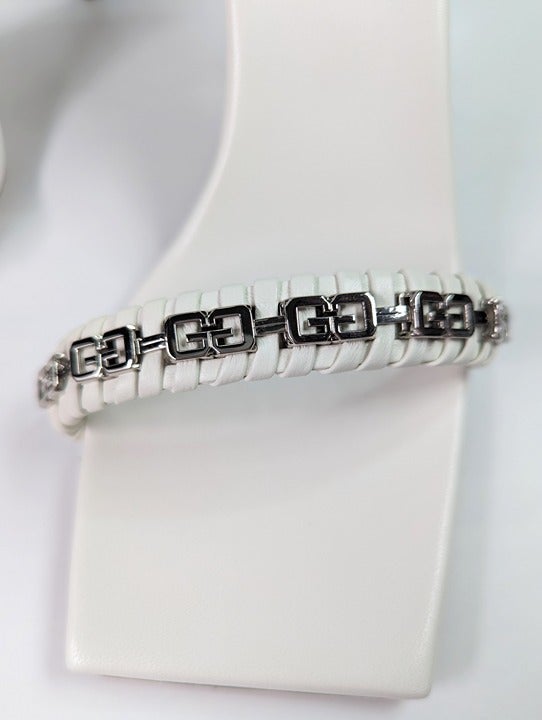 A delicate slingback leather design defines these stiletto sandals. The braided front strap is embellished with double G chain in polished metal while the back strap is rendered in elastic silicone with debossed 4G emblem.