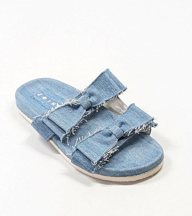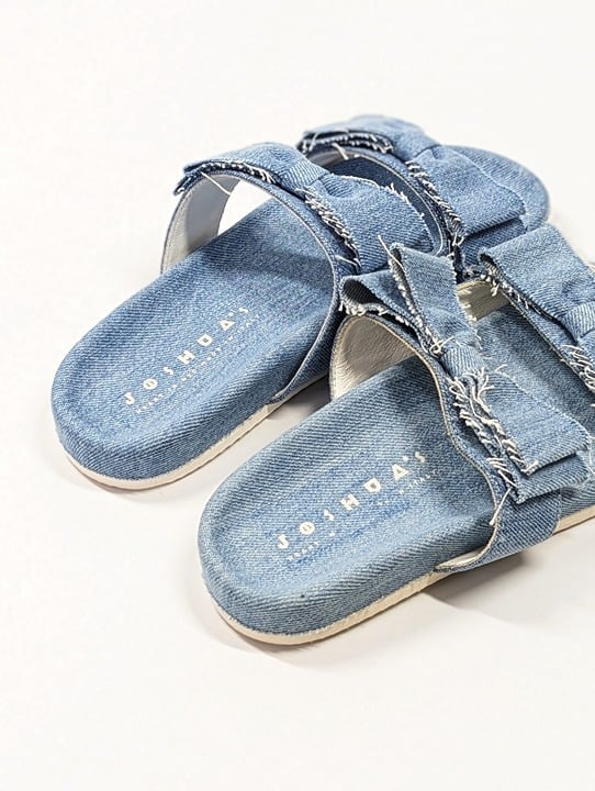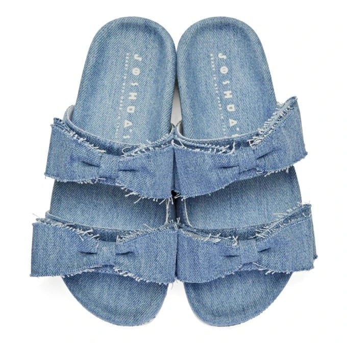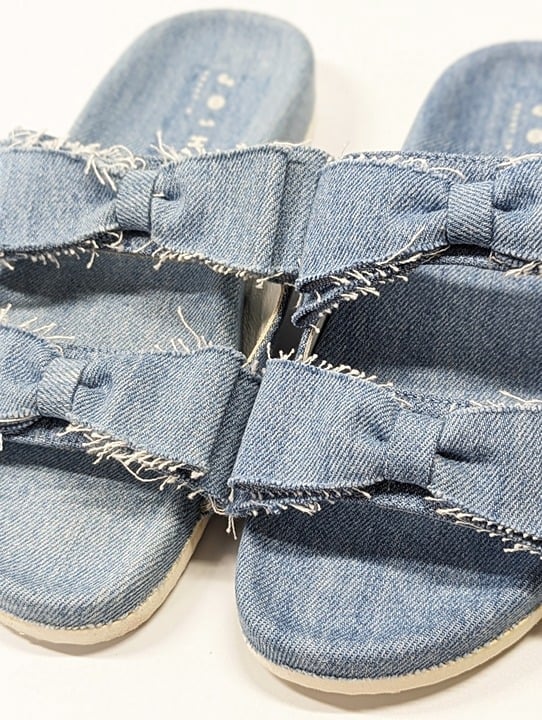 Open-toe slides feature a double strap silhouette, denim fabrication and dainty bow ties with unfinished edges. Pair with cropped pants for a relaxed day time look.