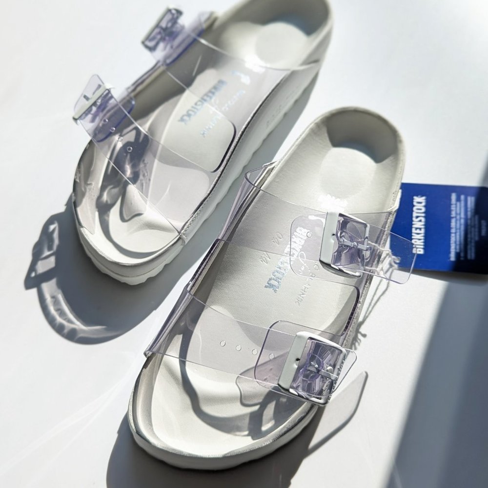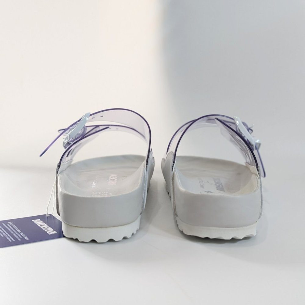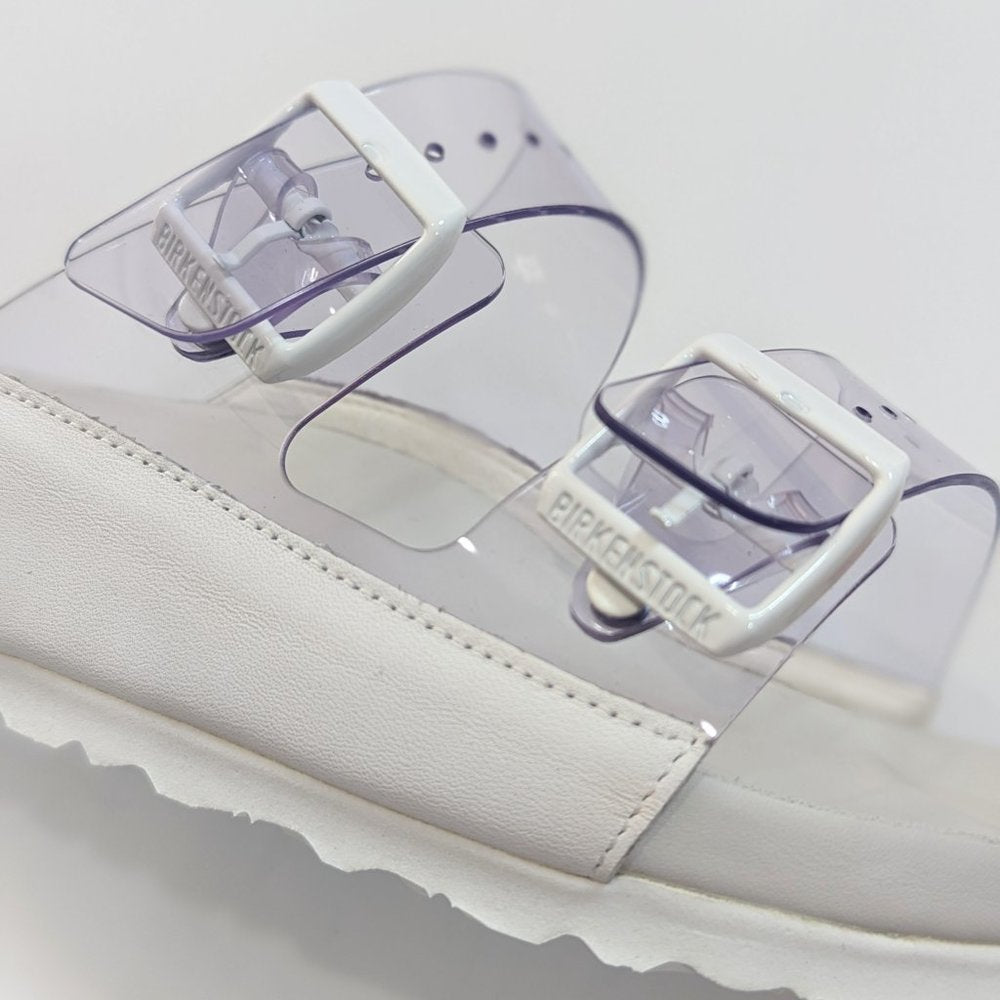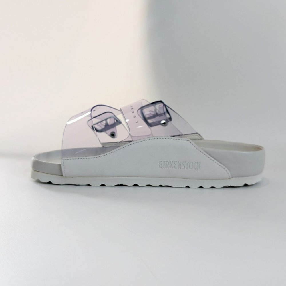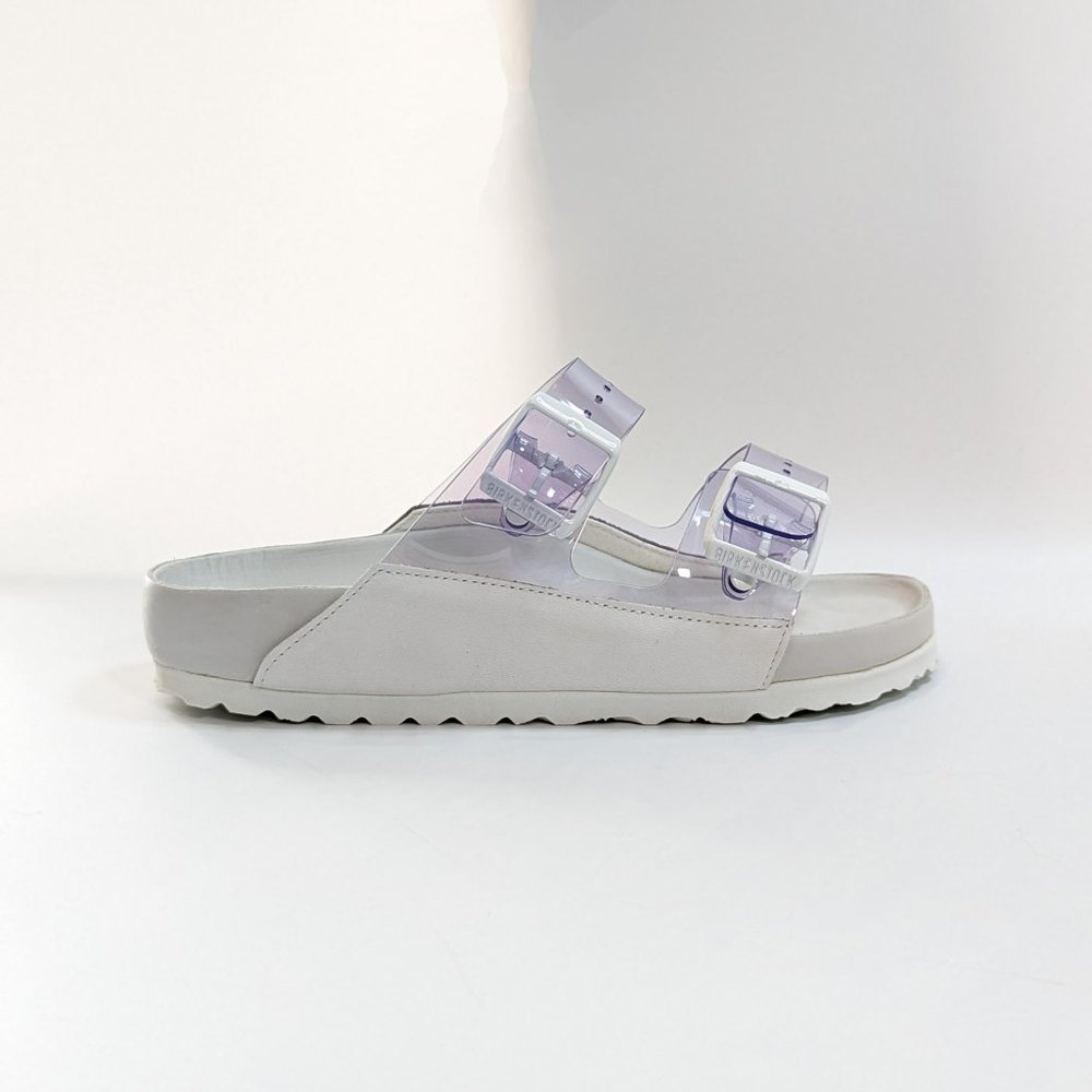 From the Manolo Blahnik x Birkenstock Collaboration. The iconic Arizona sandal is updated in a transparent construction with a smooth leather midsole. Set on a signature contoured footbed, this German-made pair is fastened by two logo-engraved buckles.