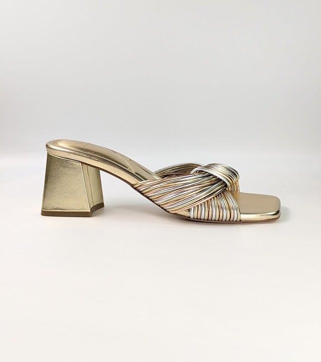 An intricate top knot details a contemporary square-toe slide sandal crafted from luxe leather and balanced on a tapered block heel.