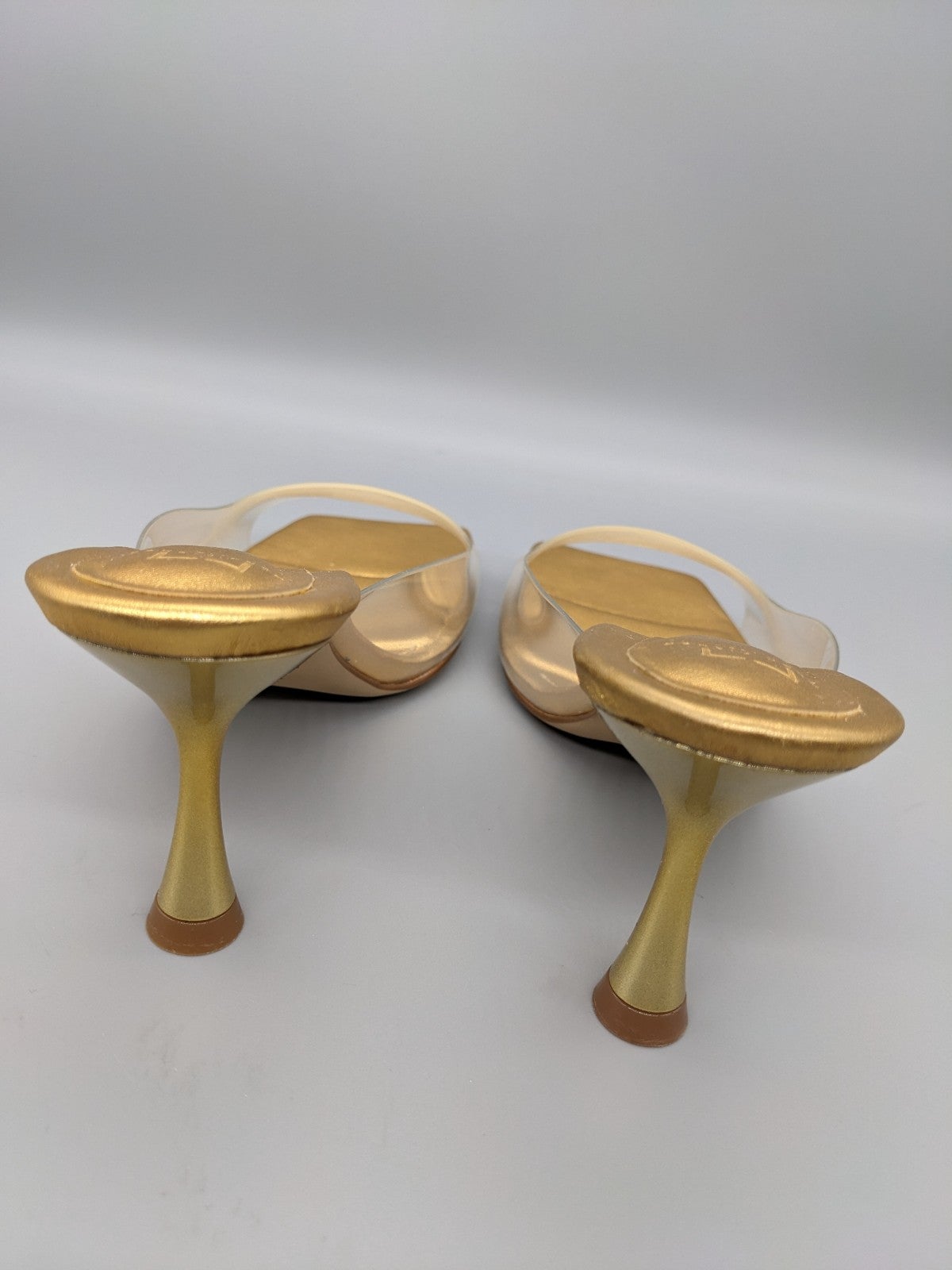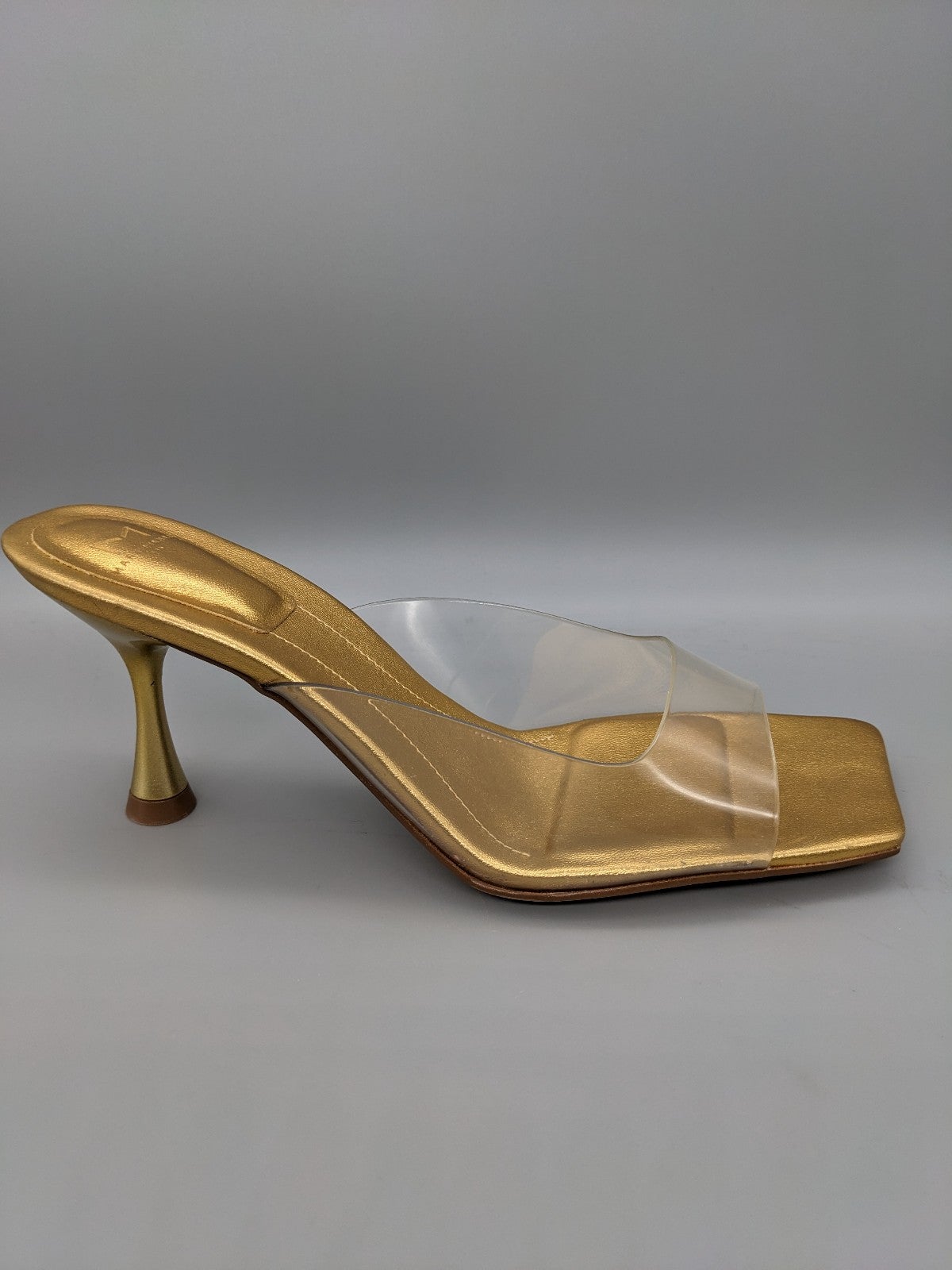 Square toe design. Synthetic lining and insole. Transparent strap on the upper. Slip-on style. Synthetic outsole. Made in Brazil.