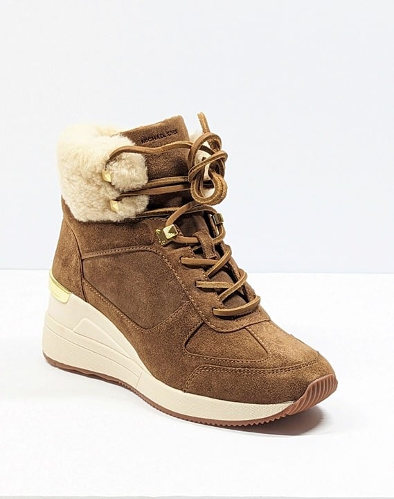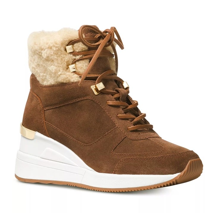 Cold-weather fashion gets a street-savvy boost in the sporty platform heel and plush shearling details on the Liv wedge booties from MICHAEL Michael Kors.