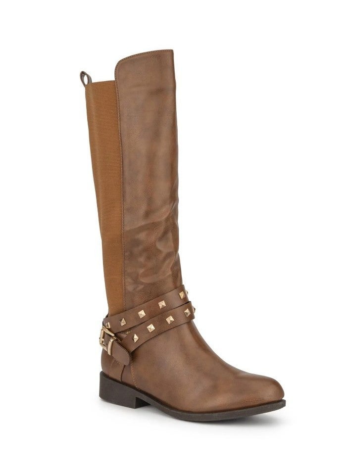 Boot Pull on design has a smooth faux-leather upper with gore side panels for easy on and off. Studded belt detail encircles the ankle. Durable rubber sole and stacked heel.