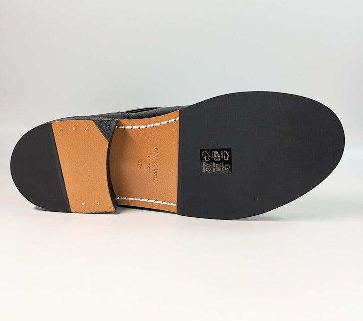 Distressed leather welt with contrasting stitch detail, rubber toplift with leather insert and nail detail