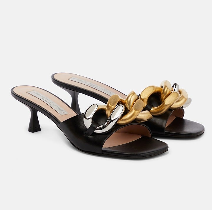 Anchored by a chic kitten heel, Stella McCartney's Falabella mules are adorned with two-tone chainlinks at the vamp strap. This Italian-made pair is crafted of vegan leather.