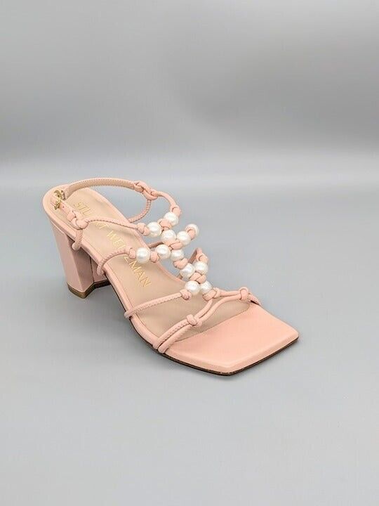 Stuart Weitzman Women's Faux Pearl Knot Nappa Leather Block-Heel Sandals Size 6.5 B