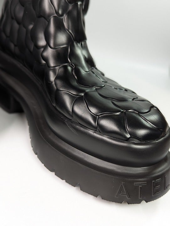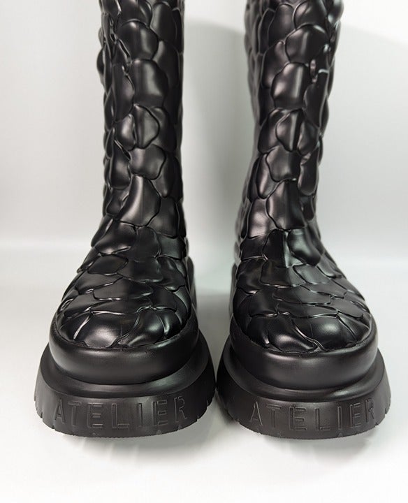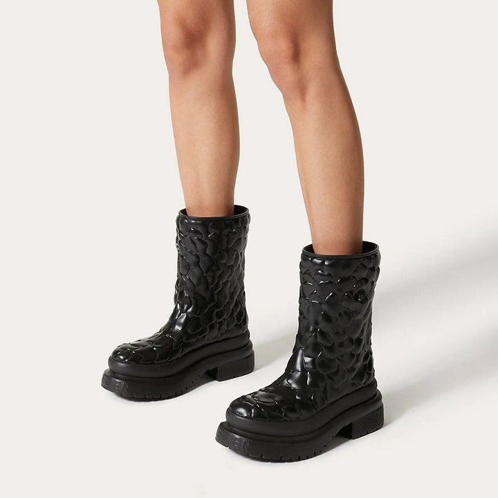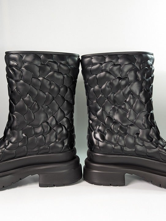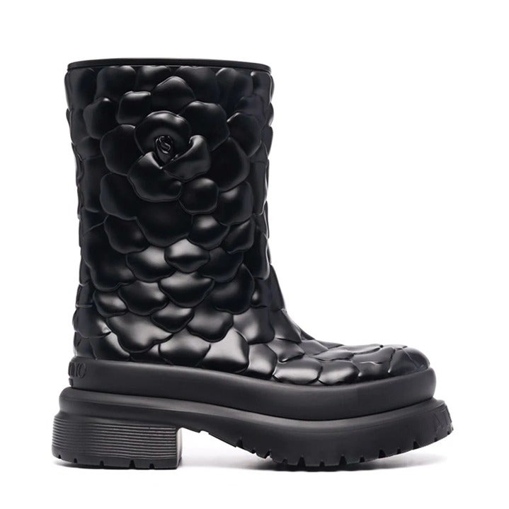 Crafted from black rubber with a 3D construction, these Atelier 03 Rose Edition boots from Valentino Garavani are adorned with a rose motif and detailed with a raised logo to the rear. Set atop a ridged rubber sole for added comfort.